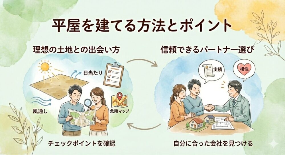 平屋を建てる時に後悔しないための最も大切なことは、「土地・間取り・費用・依頼先」を切り離さず、トータルで考えることです。