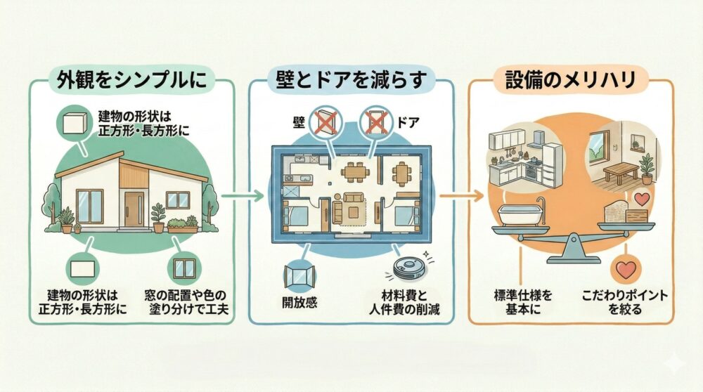 部屋を細かく仕切る『壁』や『ドア』を減らすことで、材料費と工期を削減できます。工期が少なくなればその分人件費の削減につながります。開放感も生まれますし、エアコンの設置台数を少なくすることにもつながります。
