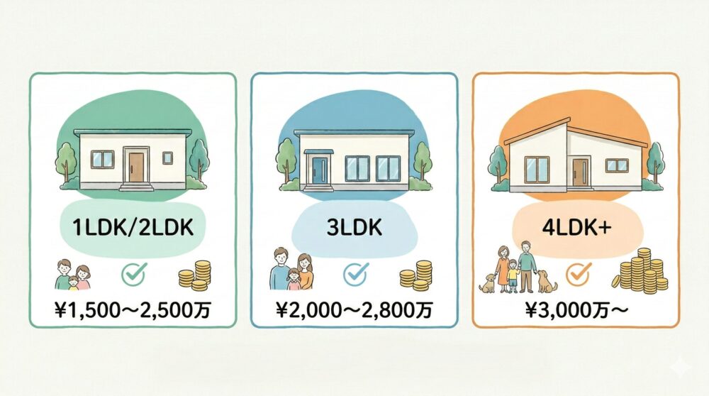 - 3LDK(25〜30坪程度):2,000万円〜2,800万円前後。